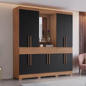 O Roupeiro 10 Portas 03 Gavetas B374 foi projetado para oferecer praticidade e funcionalidade ao seu dia a dia. Possui A 2.150 x L 2.000 x P 46,5 Cm, conta com 10 portas, painel central com espelho, cabideiros resistentes de madeira revestida, puxadores em MDF revestidos, pés em ABS, espelho de 730 x 524x x 3 mm e 03 Gavetas com corrediças metálicas que possibilitam um deslize suave, é com toda certeza o item que faltava para trazer graça ao seu quarto! Cor: Nature/Preto Altura (cm): 215 Largura (cm): 199,5 Profundidade (cm): 46,5 Cor Interna: Trama (Bege Acinzantado) Escala de Brilho: Fosco Ambiente: Quarto Acabamento: Pintura UV Texturizada Possui Vidros: Não Material Principal: MDP Produto Suporta até (Kg): 90 Kg Possui Espelho: Sim Possui Gavetas: Sim - Quantidade: 3 Und. - Peso Maximo Suportado por Gaveta: 3 Kg Possui Pés: Sim Quantidade de Pés: 8 Und. - Material dos Pés: ABS Possui Portas: Sim - Quantidade: 10 Und. - Tipo: Bater Possui Prateleiras: Sim - Peso Maximo por Prateleira: 8 Kg - Quantidade: 3 Und. Recomendações de Uso, Manutenção e Limpeza: Para limpeza de seu móvel, use uma flanela limpa e seca. Não utilize produtos químicos que possam danificar o produto. Sistema de Montagem: Parafusos e Cavilhas Necessita Montagem: Sim Complexidade da Montagem: Alta: Deve ser montado por um montador especializado. Itens Inclusos: 1 Guarda Roupa e Instrução de Montagem Garantia: 90 Dias