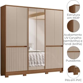Projetado para atender às necessidades do dia a dia, o Guarda-Roupa Casal Alasca oferece espaço e modernidade. Estrutura em MDP (15/ 12 mm) e acabamento em pintura UV. Composto por portas com dobradiças metálicas (inferiores sendo passantes em MDF com detalhe frisados e centrais com espelhos), cabideiros internos (alumínio), gavetas com corrediças metálicas e prateleiras funcionais. Produto com dupla opção de montagem: pés em PVC ou sapatas plásticas (2 mm) conforme preferência do cliente. Este produto será entregue em 05 volumes.