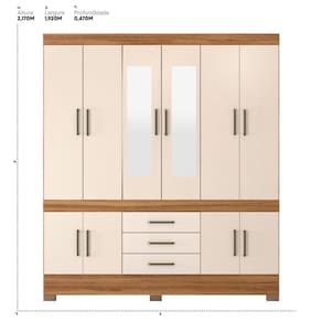 Material: MDP | Cor: Amêndola Touch | Guarda Roupa Altura x Largura x Profundidade: 2,17 x 1,92 x 0,47 | Material do Guarda Roupa: MDP | Quantidade de Portas Guarda Roupa: 10 | Quantidade de Gavetas Guarda Roupa: 3 | Cômodo Indicado: Quarto | Possui Prateleira: Sim | Possui Gaveta: Sim | Tipo da Corrediça da Gaveta do Guarda Roupa: Metálica | Tipo de Porta do Guarda Roupa: Bater | Possui pés: Não | Possui Espelho: Sim | Quantidade de espelhos: 2 | Instruções/Cuidados: Evite com líquidos. Nada de lavar os móveis. Móveis não gostam de umidade. Não deixe o móvel exposto ao sol. Os acessórios também precisam de limpeza. | Material para Filtro: MDP | Quantidade de Volumes: 3 | Peso Bruto: 106 | Altura do Produto (cm): 217 | Largura do Produto (cm): 192 | Comprimento do Produto (cm): 47 | Nome do Simples no Fornecedor: New Murano | do Fabricante: 90 dias | Produto precisa de Montagem?: Sim, a montagem é simples mas sugerimos a contratação de algum experiente de sua preferência | Material da Estrutura: MDP | Necessita Fixação na Parede: Não | Conteúdo Embalagem: Guarda Roupa Casal | Origem: | Estado de Origem: Paraná | Peso Bruto (volume 01): 55 Kg | Comprimento x Largura x Altura (volume 01): 2,15 x 0,47 x 0,10 | Peso Bruto (volume 02): 49 Kg | Comprimento x Largura x Altura (volume 02): 1,95 x 0,66 x 0,07 | Peso Bruto (volume 03): 1,4 Kg | Comprimento x Largura x Altura (volume 03): 0,70 x 0,20 x 0,06 Cor: Amêndola Touch/Off White