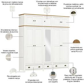 O espelho integrado transforma o ritual matinal em um momento de charme, enquanto o maleiro espaçoso acomoda até aqueles cobertores de inverno que nunca sabemos onde guardar. Cada detalhe foi pensado para a vida a dois, desde prateleiras amplas, cabideiros estratégicos até detalhes dos puxadores concha e moldura nas portas, estilo americano. Mais que um roupeiro grande, um compartimento de histórias - onde cada porta abre espaço não só para roupas, mas para memórias bem guardadas.