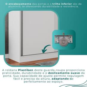 Estilo: modernoMaterial principal: MDF 15 mmEspessura do fundo e fundo da gaveta: 3 mmAcabamento: pintura texturizada UVEscala de brilho: foscaPortas: 3 portas de correr com puxador embutido em alumínioNúmero de espelhos: 1 espelho externoEspessura do espelho: 3 mmNúmero de prateleiras: 7Peso suportado por prateleira: 3 kgNúmero de gavetas: 6 gavetas internasTipo de corrediça da gaveta: metálica telescópicaPeso suportado por gaveta: 5 kgNúmero de cabideiros: 4Produto Sistema de montagem: parafusos e cavilhas