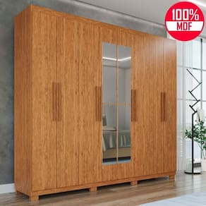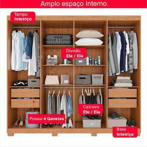 Altura: 205 cm | Largura: 219 cm | Material da Estrutura: 100% MDF | Pés: kit de pés incluso | Possui Espelho: Sim | Profundidade: 42 cm | Quantidade de Gavetas: 4 gavetas | Quantidade de Portas: 8 Portas | Tipo de Portas: Bater Cor: Cinamomo