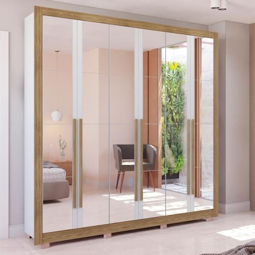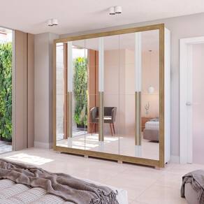 Na cor Branco/Nogueira, com 6 portas e 8 gavetas, espelho em todas as portas e pés em polipropileno, ele tem o tamanho ideal para um quarto de casal. Todo produzido com chapas de 15mm, o que garante mais robustez, firmeza e qualidade ao seu guarda-roupas.