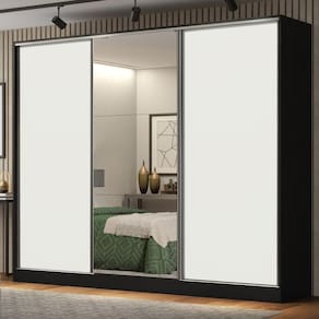 Itens inclusos: - Três (3) cabideiros - Quatro (4) gavetas internas - Oito (8) prateleiras - Três (3) portas de correr, sendo duas (2) de madeira e uma (1) com espelhos