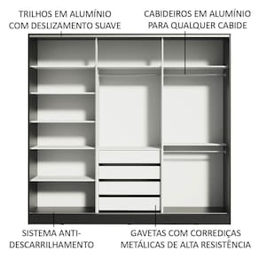 Itens inclusos: - Três (3) cabideiros - Quatro (4) gavetas internas - Oito (8) prateleiras - Três (3) portas de correr, apresentando sistema anti-descarrilhamento