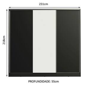 Medidas totais do armário: 218 cm de altura x 231 cm de largura x 55 cm de profundidade.