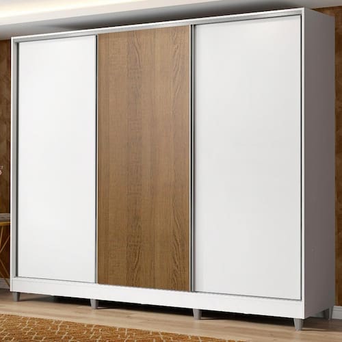 - Três (3) portas de correr com espelhos e sistema anti-descarrilhamento