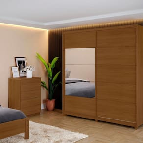Guarda-Roupa com 2 Portas deslizantes, sendo uma com espelho, estruturadas com perfís de aço em pintura epóxi e possuem freio, roldanas com rolamentos e regulagem de altura. Seu espaço interno é perfeito (Ele/Ela), possui 2 gavetas com corrediças telescópicas e fundo com reforço em cada lado . Espaço para longo, prateleiras e cabideiros em alumínio. Pintura UV e verniz de alta resistência. Todo feito em chapa de MDF de 1,5 cm, emoldurado com MDF de 2,5 cm, o que reforça e proporciona maior durabilidade ao produto. Sua grande profundidade evita que as roupas penduradas no cabideiro fiquem amassadas. O fundo do guarda-roupa é muito reforçado, pois além de ser encaixado, é parafusado, diferencial que todos guarda-roupas da Fazzio possuem. Pode ser montado com ou sem pé (opcional) Acabamento da Prateleira: Pintura UV Escala de Brilho da Prateleira: Fosco Acabamento da Gaveta: Pintura UV Possui Organizador de Gaveta: Não Acabamento da Porta: Pintura UV Escala de Brilho da Porta: Fosco Altura do Espelho 01: 44 cm Altura do Espelho 02: 44 cm Altura do Espelho 03: 44 cm Altura dos Pés: 6 cm Ambiente Principal: Quarto codigo_ean: 7900288199911 Complexidade da Montagem: Média: pode ser montado por mais de uma pessoa e/ou necessite de maior conhecimento para montagem Cor: Nogueira Cor do Produto: Nogueira Escala de Brilho: Fosco Espessura da Estrutura (mm): 15 mm Espessura das Portas (mm): 12 mm Espessura das Prateleiras (mm): 15 mm Espessura do Espelho: 3 mm Espessura do Fundo (mm): 3 mm Espessura do Fundo das Gavetas (mm): 3 mm Formato do Espelho: Retangular Itens Inclusos: 1 Guarda-Roupa, Kit Ferragens e Manual de Montagem Largura do Espelho 01: 101,5 cm Largura do Espelho 02: 101,5 cm Largura do Espelho 03: 101,5 cm Linha ou Coleção: Vilage Manual de Montagem e Instalação: https://product-hub-prd.madeiramadeira.com.br/892656200/documents/3070a69f-3bc7-48fa-8f65-ffed570802e2309524443511753379017514.pdf Marca: Móveis Fazzio Material da Gaveta: MDF Material da Porta: MDF Material da Prateleira: MDF Material dos Pés: Madeira Maciça Material Principal: MDF modular: Não Necessita Montagem: Sim Origem do Produto: Nacional Peso: 195 kg Peso Máximo por Gaveta: 6 kg Peso Máximo por Prateleira: 6 kg Possui Calceiros: 01 Possui Espelho: Sim Possui Pés: 08 Possui Portas: Sim Possui Prateleiras: Sim Produto Montado: Sim Quantidade de Espelho: 03 Espelhos com Tamanhos Diferentes Recomendações de Uso, Manutenção e Limpeza: Usar pano levemente umedecido com agua Sistema de Montagem: Parafusos atarraxantes, sistema minifix e cavilhas. Tipo de Corrediça da Gaveta: Metálica Telescópica Tipo de Dobradiça/Corrediça da Porta: Telescópica Tipo de Fixação do Espelho: Parafusos Tipo de Gaveta: Interna Tipo de Guarda-Roupa: Casal Tipo de Madeira Maciça dos Pés: Pinus Tipo de Puxador da Gaveta: Não Possui Tipo de Puxador da Porta: Não Possui Marca: Não Informado