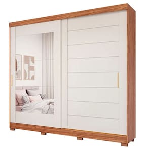 Espaço de qualidade O roupeiro todo em MDF, possui 2 portas de correr com trilho de alumínio, espelho, corrediças telescópicas, espaço para maleiro, 4 cabideiros e diversas prateleiras. A ótima distribuição de espaço combinada ao deslize fácil das portas e gavetas, facilita e muito na hora de achar e guardar o que precisar!