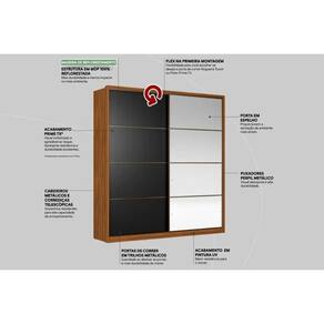Material do Calceiro - Calceiro Metálico Tipo de Cabideiro - Aéreo Material dos Cabideiros - Cabideira Metálico Tipo de Porta do Guarda-Roupa - Portas de Correr Material das Portas - Portas em MDP Material do trilho da porta de correr - Trilho Metálico Diferenciais das Portas - Porta c/ Espelho Quantidade de Portas - 2 Portas de Correr Quantidade de Portas com Espelho - 1 Porta com Espelho Tipo de Espelho - Espelho Externo Material das Gavetas - Gavetas em MDP Tipo de Corrediça - c/ Corrediças Telescópicas Quantidade de Gavetas - 3 Material das Prateleiras - Prateleiras em MDP Quantidade de Prateleiras - 4 Quantidade de Nichos - 6 Nichos