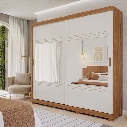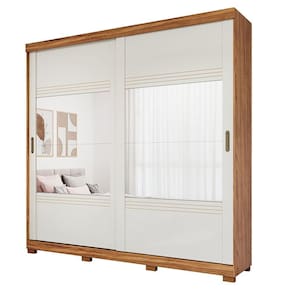 Guarda Roupa 100% MDF, espaçoso, com divisórias internas pensadas para uma perfeita organização. As portas de correr oferecem um ganho de espaço no ambiente e ainda o tornam mais elegantes e práticos, com moldura em MDF 25cm, detalhes em baixo relevo e 2 espelhos grandes. Os acessórios são de qualidade superior, roldanas com regulagem para pisos desnivelados e rolamento para deslize suave. Suas 4 gavetas internas contam com corrediças metálicas telescópicas, os puxadores são em ABS na cor Bronze e os cabideiros alumínio com suportes metálicos. Para completar, é possível optar por 2 opções de montagem do lado direito, Espaço para Roupas Longas ou Calceiro. Contém 8 pés em ABS. Acabamento da Prateleira: Pintura UV Escala de Brilho da Prateleira: Fosco Possui Cabideiros: Sim Acabamento da Gaveta: Pintura UV Escala de Brilho da Gaveta: Fosco Material do Puxador da Gaveta: MDF Possui Organizador de Gaveta: Não Acabamento da Porta: Pintura UV Escala de Brilho da Porta: Brilhante Material do Puxador da Porta: ABS Acabamento dos Pés: Impressão Altura do Espelho: 53,8 cm Altura dos Pés: 5 cm Altura Máxima dos Pés: 5.0000 Ambiente Principal: Quarto codigo_ean: 7900288143983 Complexidade da Montagem: Alta: deve ser montado por um montador especializado Cor: Cinamomo/Off White Cor da Porta: Off White Cor do Produto: Cinamomo/Off White Cor Interna: Cinamomo Escala de Brilho: Brilhante Espessura da Estrutura (mm): 15 mm Espessura das Portas (mm): 15 mm Espessura das Prateleiras (mm): 15 mm Espessura do Espelho: 3 mm Espessura do Fundo (mm): 2,5 mm Espessura do Fundo das Gavetas (mm): 2,5 mm Formato do Espelho: Retangular Gaveta com Chave: Não Itens Inclusos: 1 Guarda-Roupa, Kit Ferragens e Manual de Montagem. Largura do Espelho: 101 cm Linha ou Coleção: Marsala Manual de Montagem e Instalação: https://product-hub-prd.madeiramadeira.com.br/298555930/documents/fe0eb10d-e377-4895-aec4-056404a9059aa9d2735c1fec99871746727221.pdf Marca: Espresso Móveis Material da Gaveta: MDF Material da Porta: MDF Material da Prateleira: MDF Material dos Pés: ABS Material Principal: MDF modular: Não Necessita Montagem: Sim Origem do Produto: Nacional Peso: 240,6 kg Peso Máximo por Gaveta: 5 kg Peso Máximo por Prateleira: 5 kg Porta Janelada: Não Possui Capelinha: Não Possui Espaço para Vestidos Longos: Sim Possui Espelho: Sim Possui Espelho Interno: Não Possui Ganchos: Não Possui iluminação: Não Possui Nichos: Não Possui Painel de TV: Não Possui Penteadeira: Não Possui Pés: 08 Possui Portas: Sim Possui Prateleiras: Sim Possui Sapateira: Não Produto Montado: Sim Quantidade de Cabideiros: 02 Cabideiros Quantidade de Espelho: 04 Espelhos com Tamanhos Iguais Quantidade de Gavetas: 04 Gavetas Quantidade de Portas com Espelhos: 2 Portas com Espelho Quantidade de Prateleiras: 08 Prateleiras Recomendações de Uso, Manutenção e Limpeza: Para limpeza utilizar somente pano limpo e macio, ligeiramente umedecido em água (apenas o bastante para remover a poeira), seguido de um pano seco. Sapatas Niveladoras: Não Sistema de Montagem: Parafusos autoatarraxantes, conjuntos minifix, cavilhas de madeira, acessórios plásticos e metálicos Tipo de Corrediça da Gaveta: Metálica Telescópica Tipo de Dobradiça/Corrediça da Porta: Telescópica Tipo de Fixação do Espelho: Parafusos Tipo de Gaveta: Interna Tipo de Guarda-Roupa: Casal Tipo de Puxador da Gaveta: Não Possui Tipo de Puxador da Porta: Externo