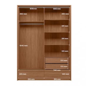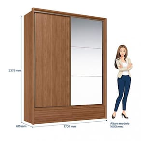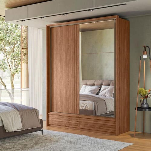 Características: Estrutura em MDP e MDF Acabamento externo com aplicação de tecnologia reverse 2 Portas de correr 4 Gavetas Corrediças telescópicas Cabideiros em alumínio Ripado Cada prateleira suporta até 8kg
