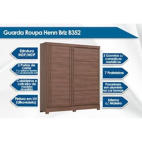 Tipo de Cabideiro - Aéreo Material dos Cabideiros - Cabideira Metálico Tipo de Dobradiças - Dobradiças Metálicas Quantidade de Portas - 2 Portas de Correr Tipo de Corrediça - c/ Corrediças Metálicas Quantidade de Gavetas - 3 Tipo dos Pés - ABS/PVC - Pés Opcionais Quantidade de Prateleiras - 10