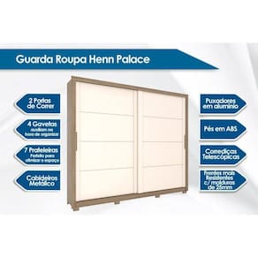 Material dos Cabideiros - Cabideira Metálico Diferenciais das Portas - Fechamento c/ Freio Anti-Impacto Quantidade de Portas - 2 Portas de Correr Tipo de Corrediça - c/ Corrediças Telescópicas Quantidade de Gavetas - 4 Gavetas Tipo dos Pés - Pés Opcionais - Pés de Madeira Quantidade de Prateleiras - 7