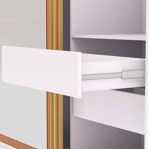 Internamente, o Guarda Roupa foi projetado para acomodar peças longas, com gavetas equipadas com corrediças telescópicas para um deslizamento suave e eficiente. A estrutura é 100% em MDF, garantindo alta resistência e durabilidade. O trilho em alumínio proporciona um deslizamento leve, enquanto a moldura metálica das portas e o acabamento dourado adicionam um toque refinado e sofisticado.
