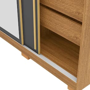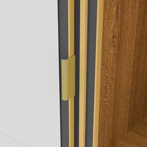 Internamente, o Guarda Roupa foi projetado para acomodar peças longas, com gavetas equipadas com corrediças telescópicas para um deslizamento suave e eficiente. A estrutura é 100% em MDF, garantindo alta resistência e durabilidade. O trilho em alumínio proporciona um deslizamento leve, enquanto a moldura metálica das portas e o acabamento dourado adicionam um toque refinado e sofisticado.