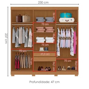 Guarda Roupa Casal 2030230, traz modernidade e praticidade ao armazenar seu vestuário. Conta com estrutura em MDP de 15 e 12 mm com acabamento UV texturizado. Composto por portas com dobradiças metálicas e puxadores em MDF 25mm, interna com amplo espaço de armazenamento, gavetas (suportando até 3kg cada) com corrediças telescópicas, cabideiros em madeira revestida (inferior sendo um calceiro) e prateleiras que suportam até 5kg cada, além de espaço para acomodar sapatos. Produto será entregue em 3 volumes.
