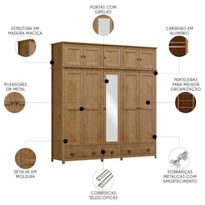 Conta com dez portas equipadas com dobradiças metálicas com amortecimento, garantindo maior durabilidade e um fechamento suave. Dentre essas, uma Porta Com Espelho adicionando um toque de elegância ao ambiente.