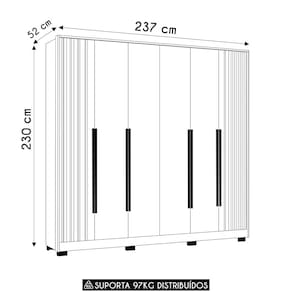 Com seis portas de dobradiças metálicas, o design permite uma abertura suave e duradoura. As portas laterais apresentam um belo detalhe ripado, que acrescenta um toque de modernidade e estilo ao Guarda Roupa 6 Portas, tornando-o um destaque no seu quarto ou closet. As quatro gavetas, equipadas com corrediças telescópicas, permitem um deslizamento perfeito, facilitando o acesso aos itens menores como roupas íntimas, acessórios e objetos pessoais. Os puxadores de MDF revestidos acrescentam um acabamento elegante, complementando o visual refinado. O design inteligente também inclui dois cabideiros em alumínio, ideais para pendurar suas roupas com praticidade e eficiência. Com moldura de 15mm, o Guarda Roupa oferece uma base robusta e estável, garantindo durabilidade e resistência. Os pés inclusos conferem um toque de leveza ao design, além de facilitarem a limpeza.