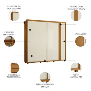 Com duas portas deslizantes de cor flex, o design inovador permite um deslizamento suave e sem esforço, proporcionando fácil acesso ao interior. As quatro gavetas, equipadas com corrediças telescópicas, oferecem maior durabilidade e facilidade de uso, permitindo o armazenamento de roupas e acessórios de forma eficiente. Os puxadores perfil em alumínio agregam um toque sofisticado, complementando o visual clean e contemporâneo do móvel. A estrutura do Guarda Roupa 2 Portas é reforçada por perfis antiempeno em aço, garantindo robustez e resistência, enquanto o aplique de MDF revestido oferece um acabamento de alta qualidade. As prateleiras internas proporcionam um amplo espaço de organização. Além disso, os dois cabideiros de alumínio oferecem um suporte ideal para pendurar suas roupas com praticidade. Com moldura de 25mm, o Guarda Roupa oferece estabilidade e resistência, tornando-se uma peça durável para o seu ambiente. Os pés inclusos não só asseguram maior durabilidade, como também facilitam a limpeza, mantendo o móvel elevado e dando um toque de leveza ao design.