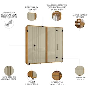 As portas convencionais do Guarda Roupa Casal contam com dobradiças metálicas com amortecimento, oferecendo um fechamento suave e silencioso. São seis portas com prateleiras internas que facilitam a organização e acomodação dos mais diversos itens. Os puxadores em MDF, combinados com puxadores laterais em alumínio, complementam o design moderno e funcional.