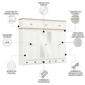 As três gavetas possuem corrediças telescópicas, que proporcionam um deslizamento suave e silencioso. Os puxadores metálicos, estilo concha na cor ouro envelhecido, completam o visual com elegância do Roupeiro.
