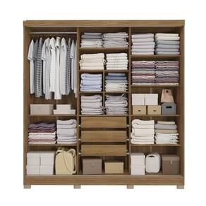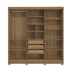 Acabamento: Pintura Brilho / Pintura Touch | Acabamento da Fita Borda: Papel | Cor: Nogueira/Macadâmia | Corrediças: Metálicas | Garantia: 3 meses para defeito de fabricação | Gavetas: Internas | Matéria-prima: MDP / Polipropileno | Peso suportado por cabideiro: 10 Kg | Peso suportado por cada prateleira: 7 kg | Puxadores: Alumínio | Quantidade de calceiros: 2 | Quantidade de gavetas: 2 | Quantidade de portas: 3 | Quantidade de prateleiras: 9 | Sistema de montagem: Parafuso Philips / Parafuso Philips e Minifix | Tipo de porta: Correr