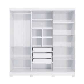 Acabamento: Pintura Brilho | Acabamento da Fita Borda: Papel | Cor: Branco | Corrediças: Metálicas | Garantia: 3 meses para defeito de fabricação | Gavetas: Internas | Matéria-prima: MDP / Polipropileno | Peso suportado por cabideiro: 10 Kg | Peso suportado por cada prateleira: 7 kg | Puxadores: Alumínio | Quantidade de calceiros: 2 | Quantidade de gavetas: 2 | Quantidade de portas: 3 | Quantidade de prateleiras: 9 | Sistema de montagem: Parafuso Philips / Parafuso Philips e Minifix | Tipo de porta: Correr