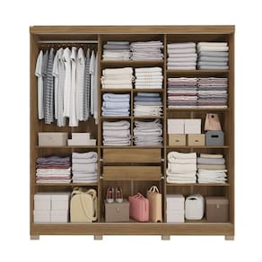 Acabamento: Pintura Touch / Pintura Touch / Fosco | Acabamento da Fita Borda: Papel | Cor: Nogueira | Corrediças: Metálicas | Garantia: 3 meses para defeito de fabricação | Gavetas: Internas | Matéria-prima: MDP / Polipropileno | Peso suportado por cabideiro: 10 Kg | Peso suportado por cada prateleira: 7 kg | Puxadores: Alumínio | Quantidade de calceiros: 2 | Quantidade de gavetas: 2 | Quantidade de portas: 3 | Quantidade de prateleiras: 9 | Sistema de montagem: Parafuso Philips / Parafuso Philips e Minifix | Tipo de porta: Correr