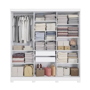 Perfeito para quem busca por muito espaço, na parte interna ele possui divisões iguais dos dois lados, o que garante facilidade na organização e divisão de espaço. E com nichos de tamanhos diferentes, esse modelo possui mais prateleiras, ideais para guardar calçados e roupas dobradas, e com dois cabideiros metálicos, você organiza peças maiores, como vestidos ou casacos, garantindo mais praticidade. Muito versátil, esse modelo ainda possui duas gavetas internas, facilitando a organização de peças menores.