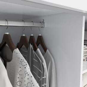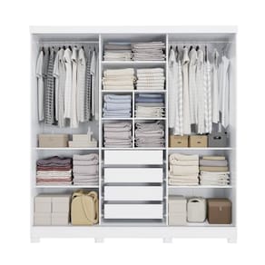 Perfeito para quem busca por muito espaço, na parte interna ele possui divisões iguais dos dois lados, o que garante facilidade na organização e divisão de espaço. E com nichos de tamanhos diferentes, ideais para guardar calçados e roupas dobradas nas prateleiras, ele conta com dois cabideiros metálicos, ideal para peças maiores, como vestidos ou casacos, garantindo mais praticidade. Muito versátil, esse modelo ainda possui quatro gavetas internas, facilitando a organização de peças menores.