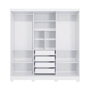 Acabamento: Pintura Brilho | Acabamento da Fita Borda: Papel | Cor: Branco | Corrediças: Metálicas | Garantia: 3 meses para defeito de fabricação | Gavetas: Internas | Matéria-prima: MDP / Polipropileno | Peso suportado por cabideiro: 10 Kg | Peso suportado por cada prateleira: 7 kg | Puxadores: Alumínio | Quantidade de calceiros: 2 | Quantidade de gavetas: 2 | Quantidade de portas: 3 | Quantidade de prateleiras: 9 | Sistema de montagem: Parafuso Philips / Parafuso Philips e Minifix | Tipo de porta: Correr