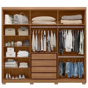 e o que você escolher colocar em cabides. E as roupas íntimas? Calma! Tem lugar para elas e outras roupas que você desejar acomodar em gavetas,