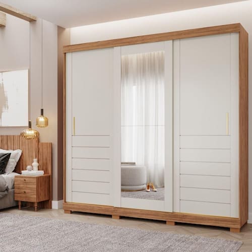 Com oito pés em ABS, o guarda-roupa Cecilia oferece estabilidade e elevação adequada para proteger seus pertences contra a umidade do chão. Além disso, apresenta dois espelhos embutidos na porta central, adicionando praticidade e funcionalidade ao espaço, tornando-o uma escolha ideal para qualquer ambiente de dormitório.