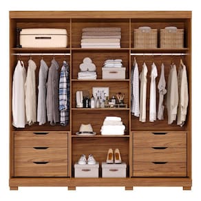 Possui seis gavetas espaçosas, proporcionando amplo espaço para guardar roupas dobradas, acessórios e outros itens pessoais. Suas três portas deslizantes garantem acesso conveniente ao interior do guarda-roupa, enquanto as corrediças telescópicas garantem um movimento suave e silencioso.