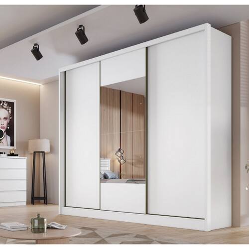 Com 6 gavetas internas e divisão interna excelente, o roupeiro garante organização e fácil acesso aos seus itens. As gavetas possuem corrediças telescópicas e puxadores que facilitam o manuseio. O cabideiro e o calceiro são feitos de alumínio, oferecendo maior resistência. O trilho inferior em alumínio e roldanas com amortecedores garantem um deslizamento suave das portas, enquanto as roldanas superiores com guia zero e freio proporcionam maior segurança e suavidade no uso.