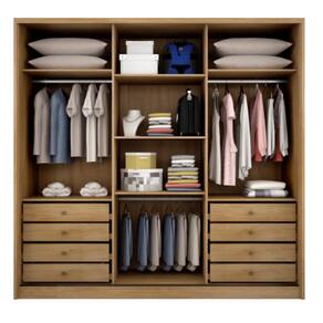 Com 6 gavetas internas e divisão interna excelente, o roupeiro garante organização e fácil acesso aos seus itens. As gavetas possuem corrediças telescópicas e puxadores que facilitam o manuseio. O cabideiro e o calceiro são feitos de alumínio, oferecendo maior resistência. O trilho inferior em alumínio e roldanas com amortecedores garantem um deslizamento suave das portas, enquanto as roldanas superiores com guia zero e freio proporcionam maior segurança e suavidade no uso.