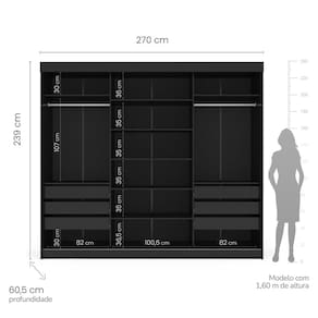 Guarda-Roupa Casal Grajaú está disponível em três versões, é ideal para quem busca maior resistência, elegância e espaço. Imponente em suas dimensões: A 239 cm x L 270 cm x P 60,5 cm, com amplo espaço interno satisfazendo as suas necessidades. Possui três portas de correr e seis gavetas com corrediças telescópicas proporcionando abertura total. Conta também com nove prateleiras e espaço para organizar roupas de cama e sapatos. Cabideiros em alumínio, com maior qualidade e durabilidade. Puxadores imponentes no comprimento das portas, trilhos inferiores em alumínio para melhor deslizamento das portas e ótimo acabamento com pintura U.V. de alta resistência para satisfazer as necessidades dos clientes. Materiais de 1ª qualidade que respeitam o meio ambiente. As portas dos nossos produtos são em MDP de 15 mm com revestimento em FF (Finish Foil), garantindo assim maior durabilidade e usabilidade, e por essa razão as partes internas são brancas. Atenção na hora de montar o seu produto! Acabamento da Prateleira: Pintura Texturizada UV Escala de Brilho da Prateleira: Fosco Possui Cabideiros: Sim Acabamento da Gaveta: Pintura Texturizada UV Escala de Brilho da Gaveta: Fosco Possui Organizador de Gaveta: Não Acabamento da Porta: Pintura Texturizada UV Escala de Brilho da Porta: Fosco Material do Puxador da Porta: Alumínio Altura do Espelho: 220 cm Ambiente Principal: Quarto codigo_ean: 7909903905371 Complexidade da Montagem: Média: pode ser montado por mais de uma pessoa e/ou necessite de maior conhecimento para montagem Cor: Preto Cor do Produto: Preto Cor Flex: Não Cor Interna: Preto Escala de Brilho: Brilhante Espessura do Espelho: 3 mm Formato do Espelho: Retangular Itens Inclusos: 01 Guarda Roupa e 01 Manual de Montagem. Largura do Espelho: 91 cm Linha ou Coleção: Grajaú Manual de Montagem e Instalação: https://product-hub-prd.madeiramadeira.com.br/937899/documents/9fe29379-8104-42ba-b880-777aea52f09fardaRoupaCasalGrajaYescasa.pdf Material da Gaveta: MDP Material da Porta: MDP/Vidro Material da Prateleira: MDP Material Principal: MDP modular: Não Montagem Flex: Não Necessita Montagem: Sim Origem do Produto: Nacional Peso: 253,52 kg Peso Máximo por Gaveta: 4 kg Peso Máximo por Prateleira: 5 kg Possui Calceiros: Não Possui Espelho: Sim Possui Pés: Não Possui Portas: Sim Possui Prateleiras: Sim Produto Montado: Sim Quantidade de Espelho: 12 Espelhos com Tamanhos Iguais Quantidade de Gavetas: 06 Gavetas Quantidade de Prateleiras: 09 Prateleiras Recomendações de Uso, Manutenção e Limpeza: A limpeza do móvel deve ser efetuada somente com pano macio e seco. Não utilizar produtos abrasivos ou similares, tais como: Cera; Álcool; Detergentes; Tinner; Lustra Móveis; etc. Sistema de Montagem: Parafusos, cavilhas, pregos, dispositivo trapézio e porcas cilíndricas. Suporta Até (kg): 117 kg Tipo de Corrediça da Gaveta: Metálica Telescópica Tipo de Dobradiça/Corrediça da Porta: Metálica Tipo de Fixação do Espelho: Molduras Tipo de Gaveta: Interna Tipo de Guarda-Roupa: Casal Tipo de Puxador da Gaveta: Não Possui Tipo de Puxador da Porta: Externo