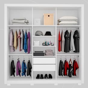 Com três portas e duas gavetas espaçosas, oferece amplo armazenamento para roupas, acessórios e objetos pessoais.