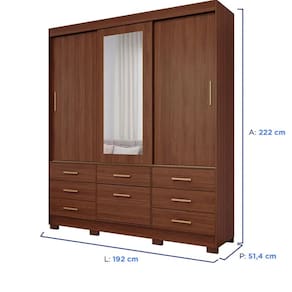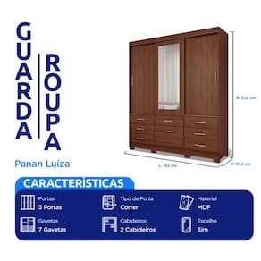 Características: Marca: Panan Modelo: Luiza Tipo: Casal Tipo de porta: Correr Quantidade de portas: 3 portas Quantidade de gavetas: 7 gavetas Quantidade de cabideiros: 2 cabideiros Sapateira: Sim Espelho: Sim Tamanho do espelho: 119,2X45 cm Espessura do espelho: 3 mm Gaveta com chave: Não Tipo de roldanas: Metálicas Tipo de corrediças: Telescópicas Material da estrutura: MDF Material dos puxadores: MDF Pés: Sim Material dos pés: ABS Acabamento: Pintura UV Escala de brilho: Fosco Sistema de montagem: Minefix, parafusos e cavilhas