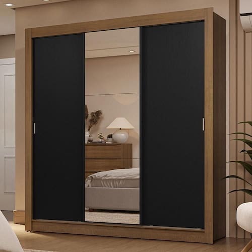 Características principais: Conta com portas de correr que deslizam suavemente, graças aos trilhos superiores e inferiores em alumínio. Isso garante um funcionamento tranquilo e sem esforço. Uma das portas conta com espelhos, que são úteis no dia a dia e deixam o móvel ainda mais elegante.