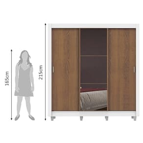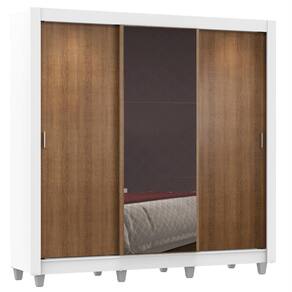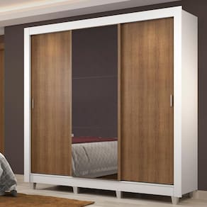 - Itens inclusos: 3 prateleiras totalizando quatro nichos, 4 gavetas internas, 1 cabideiro grande, 3 portas de correr sendo duas de madeira com puxadores em PVC e uma 1 com espelho, 1 Kit com oito pés em PVC