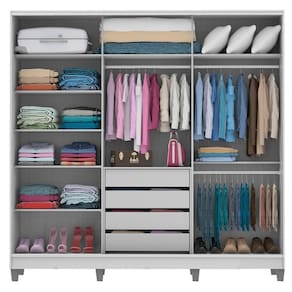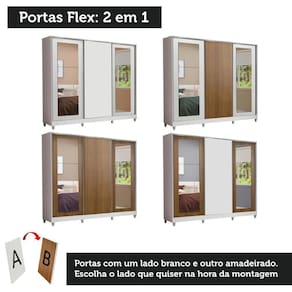 - Itens inclusos: Três cabideiros, quatro gavetas internas, oito prateleiras, três portas de correr, sendo uma de madeira e duas com espelhos, todas apresentando sistema anti-descarrilhamento e puxadores em alumínio em toda a extensão, um kit com oito pés em PVC;