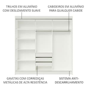 Os dois cabideiros são em alumínio e possuem espaços tanto para roupas curtas quanto mais longas. Ou seja, tem lugar pra organizar tudo: roupas, calçados, malas, travesseiros, edredons e muito mais.