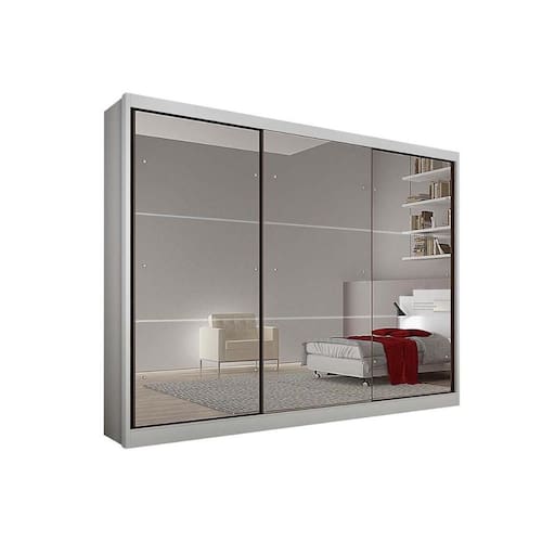 Material do Calceiro - Calceiro Metálico Tipo de Cabideiro - Aéreo Material dos Cabideiros - Cabideira Metálico Tipo de Porta do Guarda-Roupa - Portas de Correr Material das Portas - Portas em MDF Tipo de Dobradiças - Dobradiças Metálicas Diferenciais das Portas - Porta c/ Espelho Quantidade de Portas - 3 Portas de Correr Quantidade de Portas com Espelho - 3 Portas com Espelho Tipo de Espelho - Espelho Externo Quantidade de Espelhos - 3 Espelhos Material das Gavetas - Gavetas em MDF Quantidade de Gavetas - 4 Gavetas Material das Prateleiras - Prateleiras em MDF Quantidade de Prateleiras - 8 Quantidade de Nichos - 2 Nichos