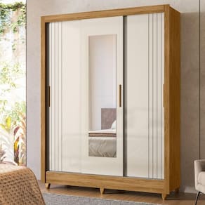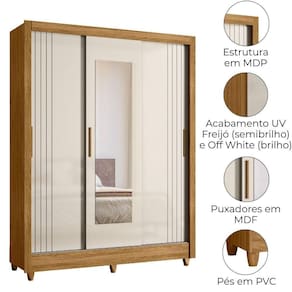 Projetado para atender às necessidades do dia a dia, o Guarda Roupa Casal Bolívia oferece espaço e modernidade. Estrutura em MDP (15/ 12 mm) e acabamento em pintura UV. Composto por portas de correr (central com espelho, laterais com frisos em baixo relevo) com abertura por trilho de alumínio, cabideiro interno (alumínio), prateleiras e gavetas com corrediças metálicas. Produto com dupla opção de montagem: pés em PVC ou sapatas plásticas (2 mm) conforme preferência do cliente. Este produto será entregue em 02 volumes.
