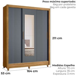 Projetado para atender às necessidades do dia a dia, o Guarda Roupa Casal Bolívia oferece espaço e modernidade. Estrutura em MDP (15/ 12 mm) e acabamento em pintura UV. Composto por portas de correr (central com espelho, laterais com frisos em baixo relevo) com abertura por trilho de alumínio, cabideiro interno (alumínio), prateleiras e gavetas com corrediças metálicas. Produto com dupla opção de montagem: pés em PVC ou sapatas plásticas (2 mm) conforme preferência do cliente. Este produto será entregue em 02 volumes.