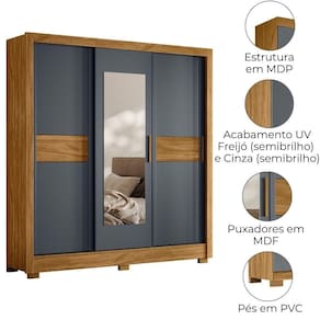 Aliando design moderno e praticidade, o Guarda Roupa Casal Bahamas proporciona organização completa. Estrutura em MDP (15/ 12 mm) e acabamento em pintura UV. Composto por portas de correr (central com espelho, laterais com detalhe em moldura MDF 25mm) com abertura por trilho de alumínio, cabideiro interno (alumínio), gavetas com corrediças metálicas e prateleiras. Produto com dupla opção de montagem: pés em PVC ou sapatas plásticas (2 mm) conforme preferência do cliente. Este produto será entregue em 03 volumes.