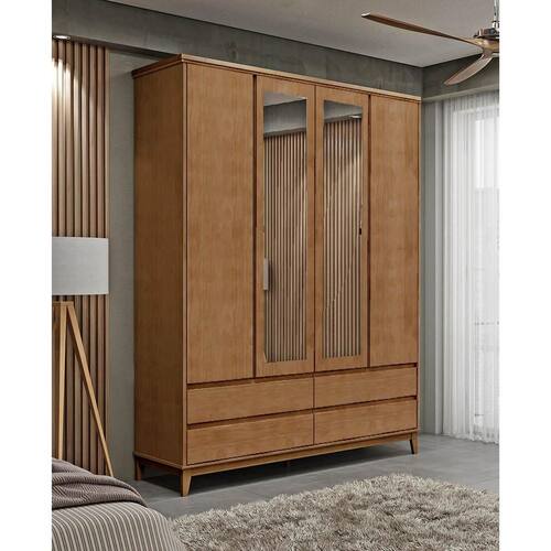 Guarda-Roupa Casal 4 Portas Espelhos 4 Gavetas Freijó Prata Madeira Pinus com MDF - Finestra