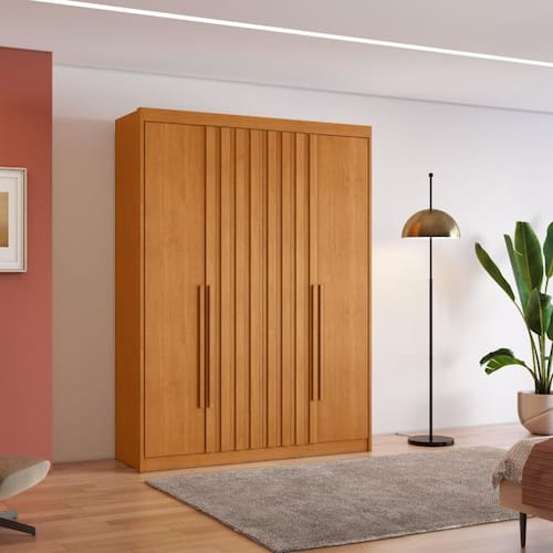 O Guarda Roupa Casal 4 Portas Ripado Gr?cia Conquista M?veis ? a escolha ideal para quem busca funcionalidade e eleg?ncia. Composto por, 4 gavetas, 4 nichos e 4 prateleiras, ele oferece amplo espa?o para organiza??o. As gavetas possuem corredi?as telesc?picas, garantindo abertura suave e silenciosa. O guarda-roupa conta ainda com cabideiros em alum?nio para facilitar o armazenamento de roupas e dobradi?as de press?o de 35mm, que proporcionam maior resist?ncia e durabilidade. Sua estrutura ? feita em MDF de 15mm, material que assegura qualidade e estabilidade, com puxadores em madeira, agregando um toque sofisticado ao design. Diferencial s?o suas portas que pode ser escolhido onde deve ser montado as duas portas com detalhes ripados.